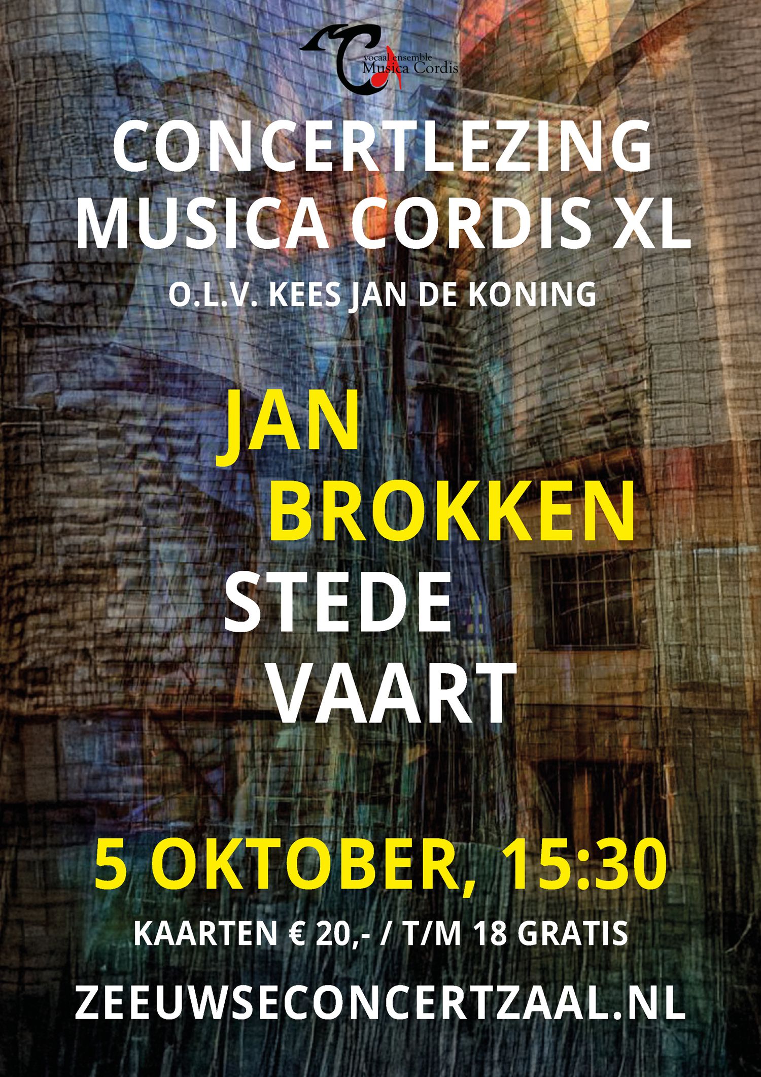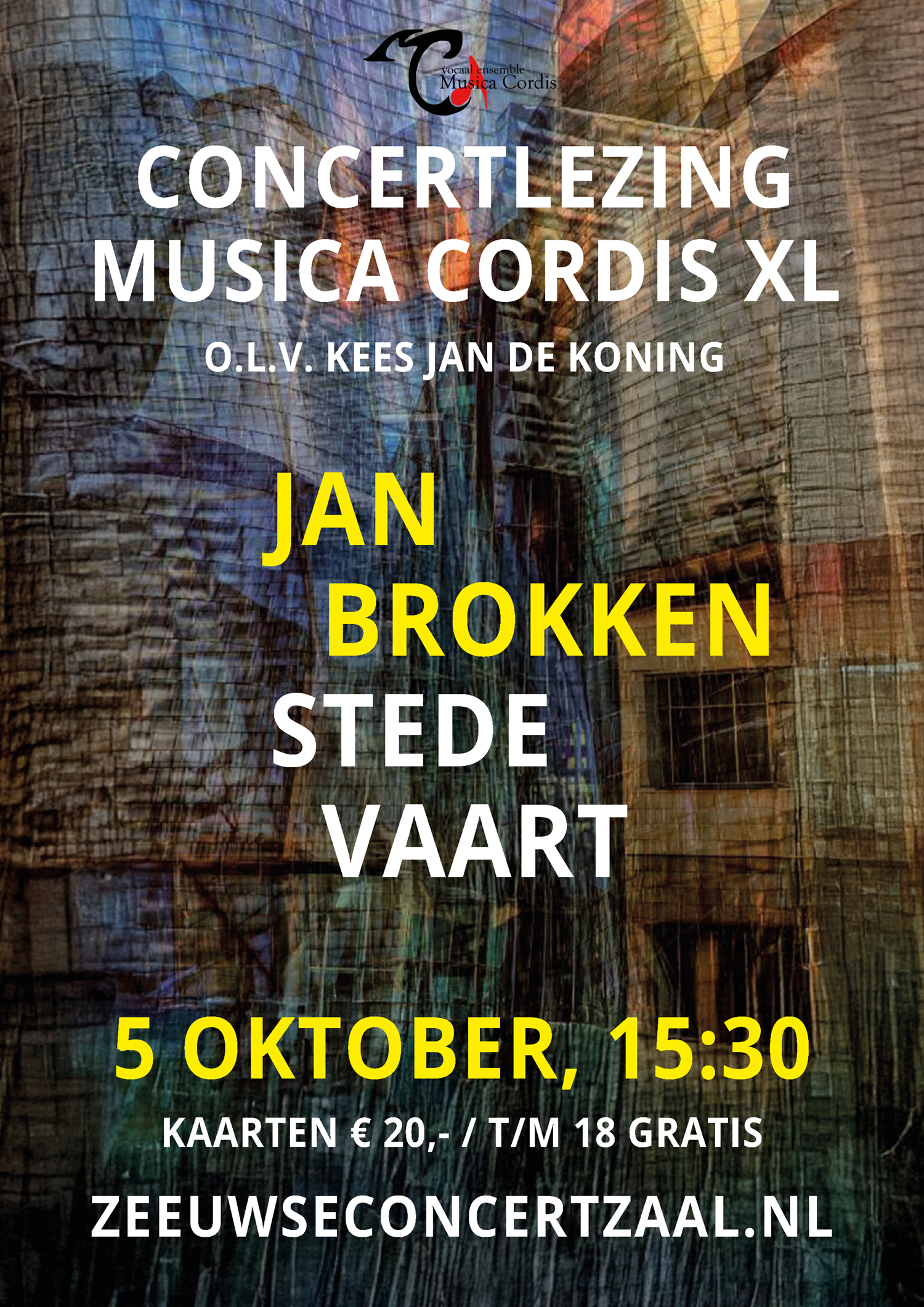 Over de internationaal befaamde Jan Brokken schreef de Italiaanse La Repubblica: 'een van de origineelste schrijvers van dit moment, veelzijdig, diepgravend, virtuoos en muzikaal – in alle opzichten van het woord.’ Kamerkoor Musica Cordis uit Goes verzorgt al ruim veertig jaar boeiende concerten rondom een thema. Daarnaast werkt het koor o.l.v. basbariton en befaamde koordirigent Kees Jan de Koning mee aan missen en festivals. Het repertoire bestaat uit meerstemmige vocale composities van de 14e t/m de 21e eeuw, meestal a capella zes-, acht- of twaalfstemmig uitgevoerd.
