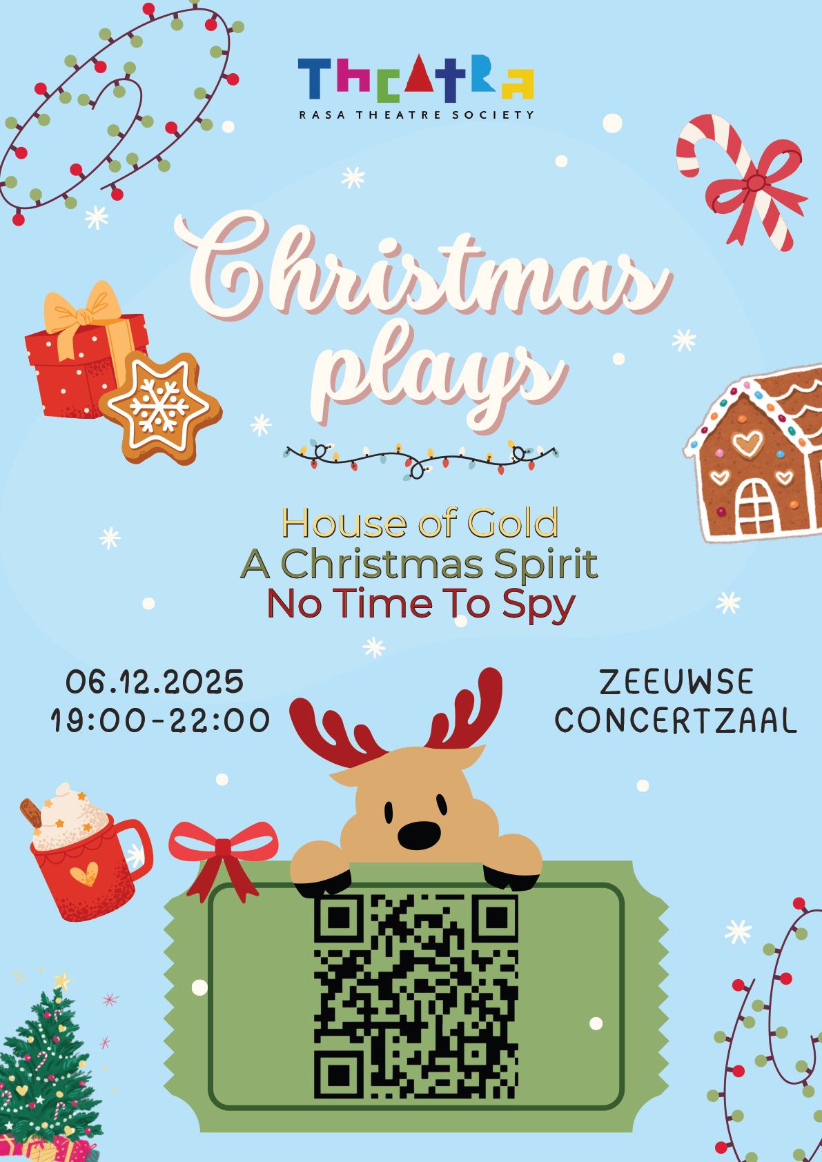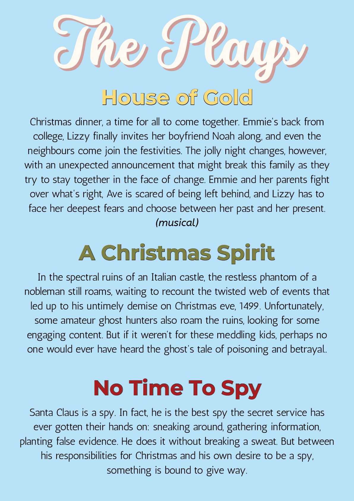 Christmas Plays is een voorstelling van drie toneelstukken over kerst, geschreven, geproduceerd, geregisseerd, en gespeeld door studenten van University College Roosevelt. House of Gold volgt een familie kerst diner dat onderbroken wordt door een onverwachte aankondiging die de familie dreigt te verscheuren. In A Christmas Spirit verteld een geest over zijn moord op kerstavond in 1499, en de omstandigheden die daartoe hebben geleid. No Time to Spy gaat daarentegen over de kerstman en zijn conflict tussen het helpen van anderen en zijn eigen geluk. De gehele voorstelling is in het Engels. Er komt grof taalgebruik voor in één van de toneelstukken (No Time to Spy)